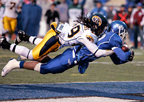 Buffalo started strong and scored on their first drive, propelled by a 55 yard James Starks run. Drew Willy sneaked in from the 1, and Buffalo led 7-0. The Flashes responded in kind, with a 50-yard touchdown run by Eugene Jarvis. "Quarterback"* Julian Edelman twice drove the Flashes into field goal range, Kent only converted once, taking a 10-7 lead into halftime.