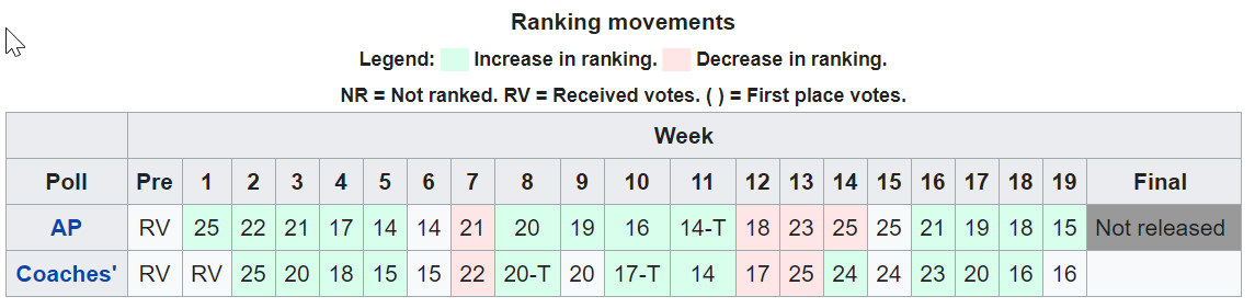 The Bulls have now been ranked 19 weeks, since the second week of the season, and the highest they have been is 14. If the Bulls make it into week two of the tournament its a fair bet that they end up ahead of that season high.
